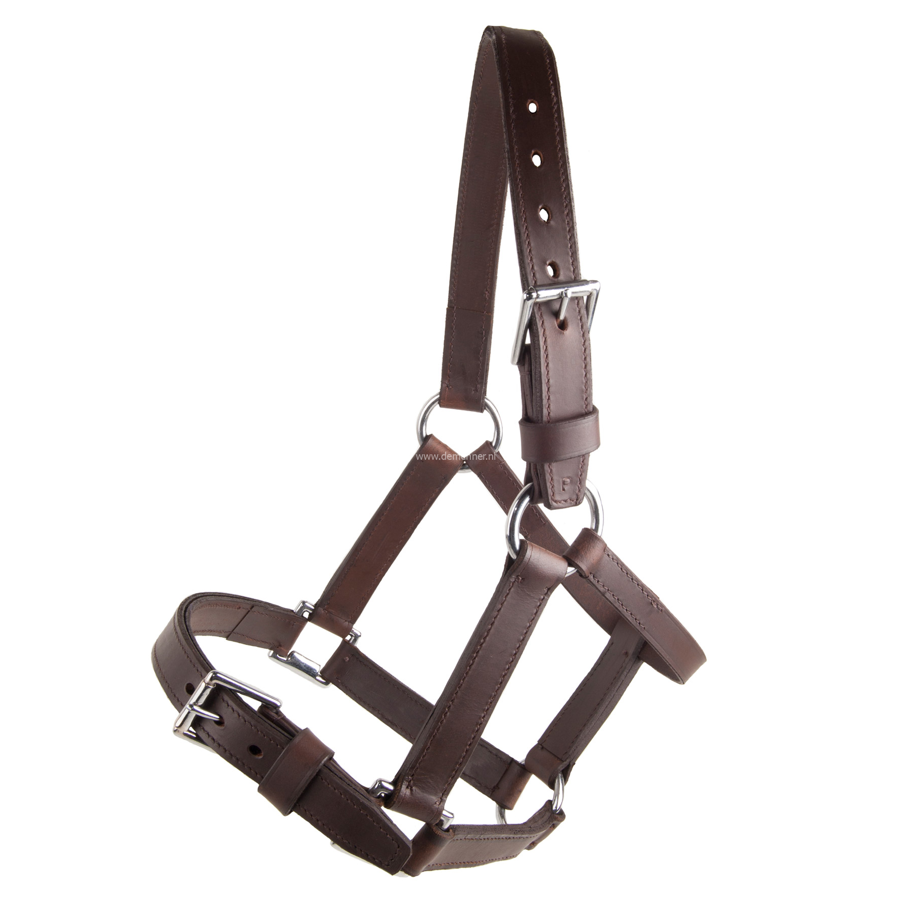 Dit soepele maar sterke lederen halster is voorzien van een gespsluiting op de neus, hierdoor kan men makkelijk het halster verwijderen nadat het menhoofdstel is aangebracht.