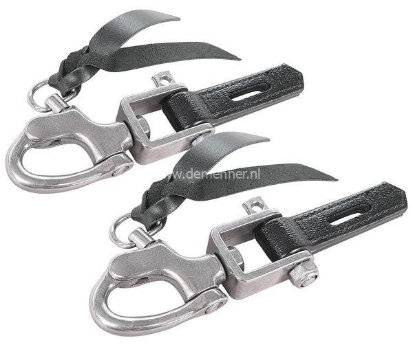Met deze sluitingen kunnen strengen met D-ring gecombineerd worden met een (antieke) koets met krulhaak bevestiging.